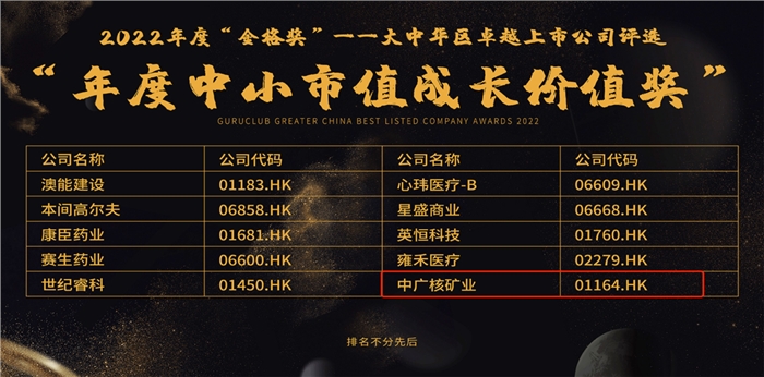 12月16日,中廣核礦業在“全球投資嘉年華·2023”活動中榮獲金格獎“年度中小市值成長價值獎”,公司董事長安軍靖先生榮膺“年度卓越領袖獎”。